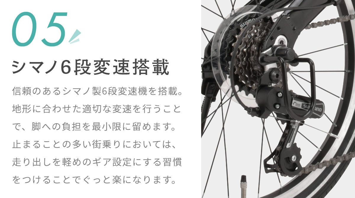 一般的な折りたたみよりも大径の52Tギアを搭載することで、20インチ小径タイヤとは思えないほどのスピードを実現しています。